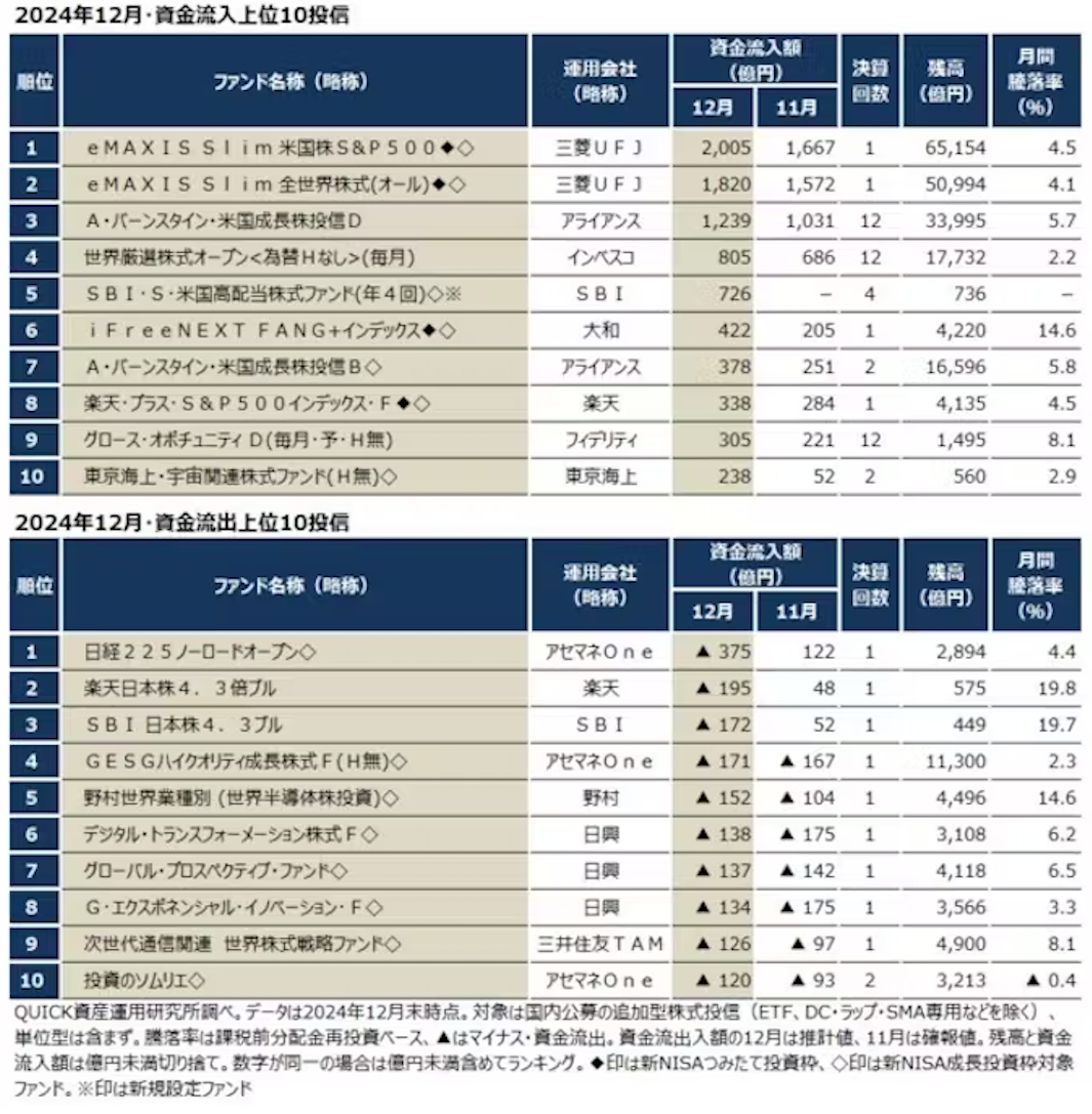 2024年12月の投資信託市場では、いくつかのファンドが大きな注目を集め、資金流入ランキングで上位を占めました。ここでは、特に資金流入が多かったファンドの特徴を詳しく解説します。
